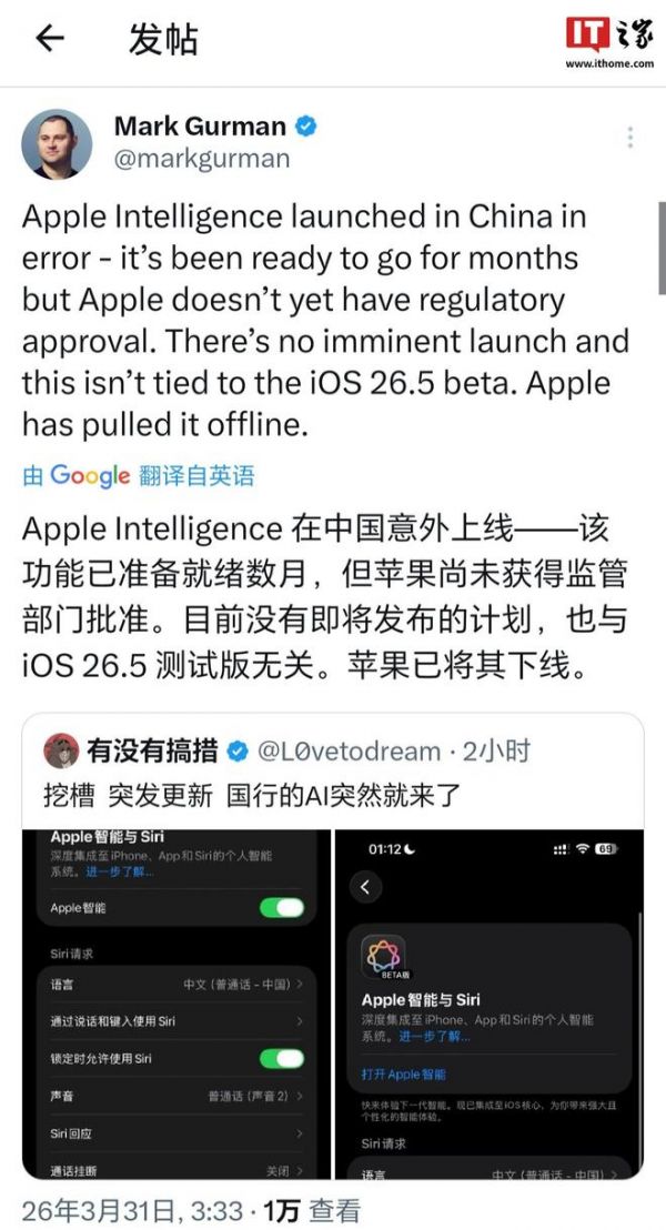 IT之家 3 月 31 日消息,据彭博社马克 · 古尔曼今日消息,Apple Intelligence 在中国属于意外上线,该功能已准备就绪数月,但苹果尚未获得监管部门批准。目前没有即将发布的计划,也与 iOS 26.5 测试版无关。苹果已将其下线。