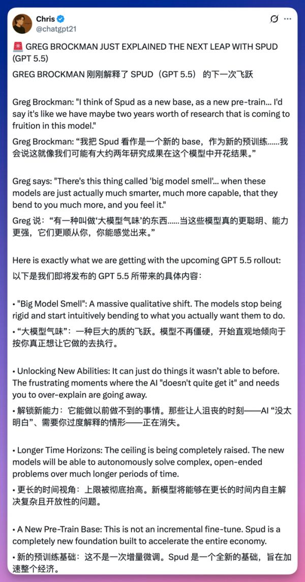 目前能查到出处的,「Spud」这个代号确实存在。The Information 报道过,Sam Altman 和 OpenAI 总裁 Greg Brockman 都公开提过。