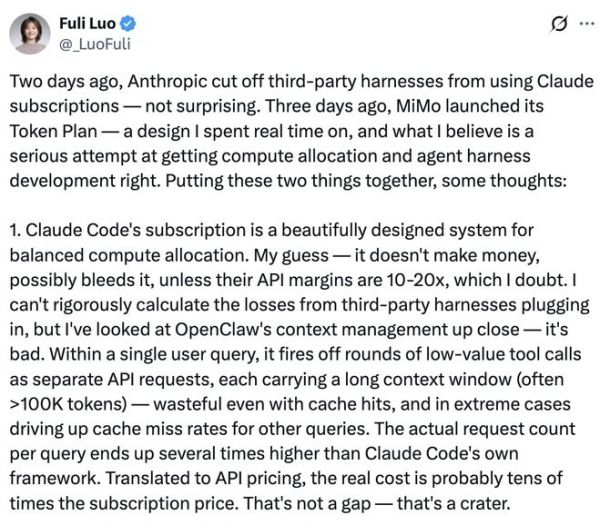 两天前,Anthropic宣布切断第三方调用框架通过Claude订阅接入的通道。Xiaomi MiMo大模型负责人罗福莉(Fuli Luo)随即发文,结合三天前MiMo刚刚推出的Token计划,对这一事件作出深度解读。