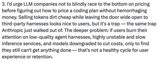 她同时提醒各大语言模型公司,在尚未厘清编程计划成本结构之前,不应盲目卷入定价竞底。廉价出售token同时对第三方框架敞开大门,表面上对用户友好,实则是一个陷阱——而Anthropic刚刚走出了这个陷阱。