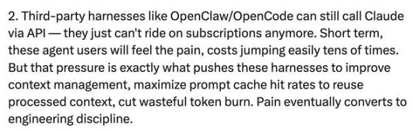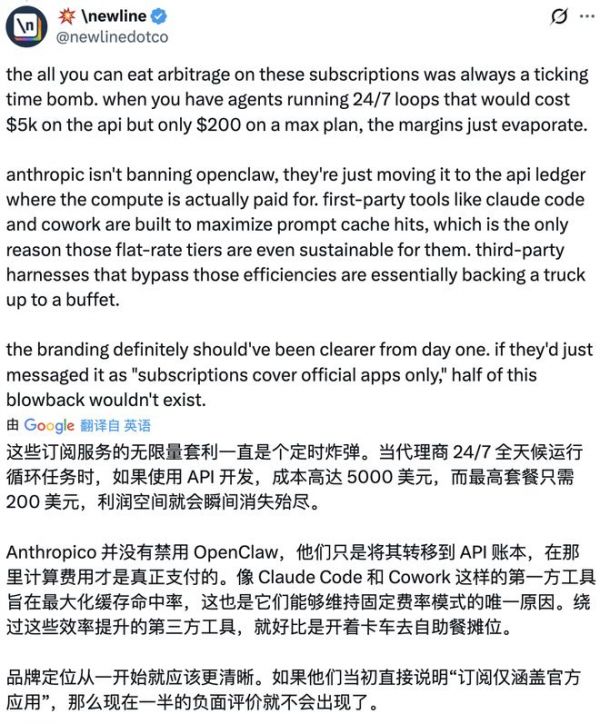 AI工作坊组织者@newlinedotco评论称:订阅的“all you can eat”套餐从一开始就是定时炸弹——第三方harness(如OpenClaw)24/7循环调用,API成本可能高达5000美元,而订阅仅200美元。官方工具(如Claude Code)因优化prompt cache才可持续。