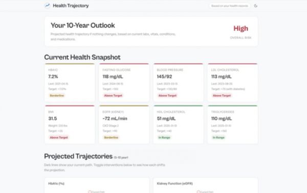 Perplexity Health的核心是一个健康仪表盘,基于当前的实验室、生命体征和状况,绘制未来10年的健康展望,追踪生物标志物与临床目标,并建模特定干预措施如何随时间改变用户的健康状况。