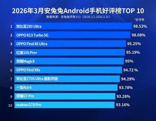 2026年3月安兔兔Android手机好评榜TOP10榜单 / 展示10款手机的排名及对应好评率
