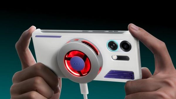 带散热风扇的OPPO手机 / 白色OPPO手机搭配带红光的散热风扇