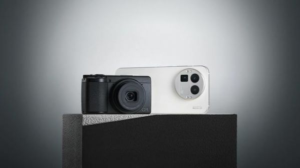 realme手机与理光GR相机 / 白色realme手机和黑色理光GR相机同框