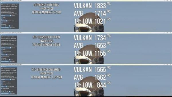 性能测试界面对比图 :三栏展示不同纹理压缩的帧率与显存数据NTC用AI重构了纹理存储逻辑