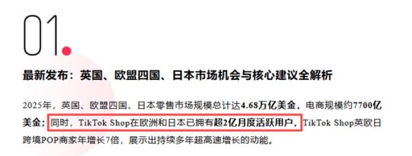 近期召开的TikTok Shop英欧日跨境POP年度大会披露的一组数据显示,2025年,TikTok Shop欧日月活用户已经突破2亿,规模和美国市场基本相当。