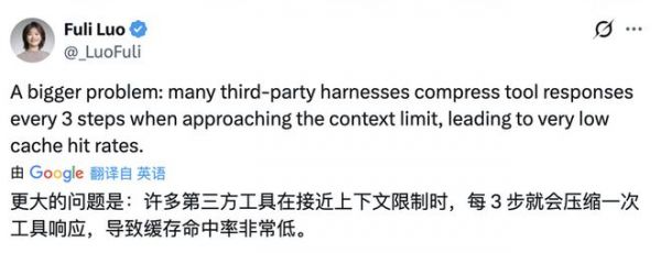 第二个层面是缓存效率。她在评论区补充道:"更大的问题是,很多第三方 harness 在接近上下文长度限制时,每隔几步就压缩一次工具返回结果,导致 cache 命中率极低。"