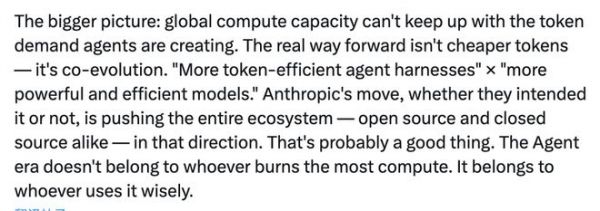她写道:"全球算力的供给速度,已经追不上 Agent 场景下 token 消耗的增速。真正的出路不是更便宜的 token,而是协同进化,更高 token 效率的 agent harness,乘以更强大、更高效的模型。Anthropic 这次,不管主观意图是什么,客观上把整个生态,无论开源还是闭源,都推向了这个方向。Agent 时代不属于烧算力最多的人,而属于用算力最聪明的人。"