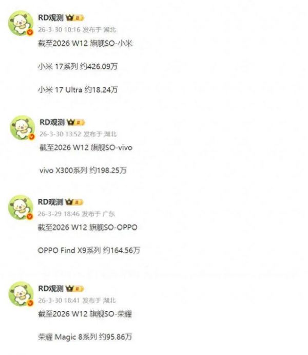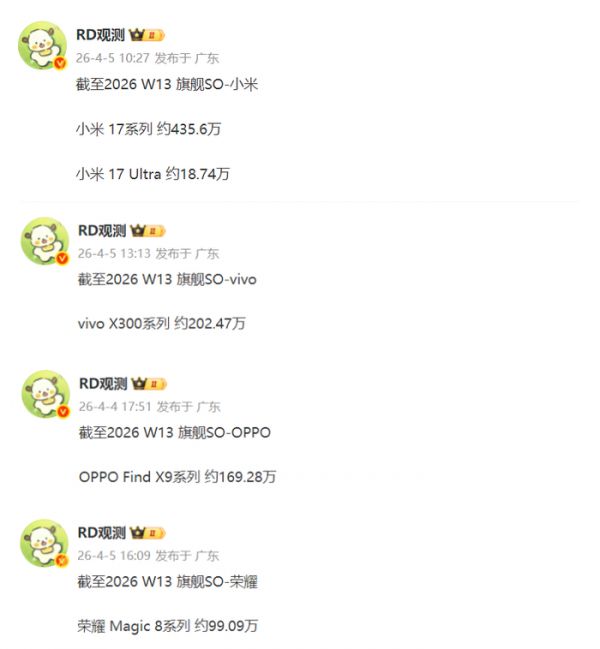 这是行业人士“RD观测”提供的国产四大安卓品牌当家旗舰,截至2026年W13周的销量数据。数据显示小米17系列累计销量已经达到435.6万台,其中小米17 Ultra系列的销量为18.74万台;vivo X300系列的累计销量为202.47万台;OPPO Find X9系列的累计销量为169.28万台;荣耀Magic8系列的累计销量为99.09万台。这样算下来vivo X300系列+OPPO Find X9系列+荣耀Magic8系列的合计销量为470.84万台,看到了吗?友商三个当家旗舰加在一起才勉强超越小米17系列,问题的关键在于论周销量它们也不是对手。