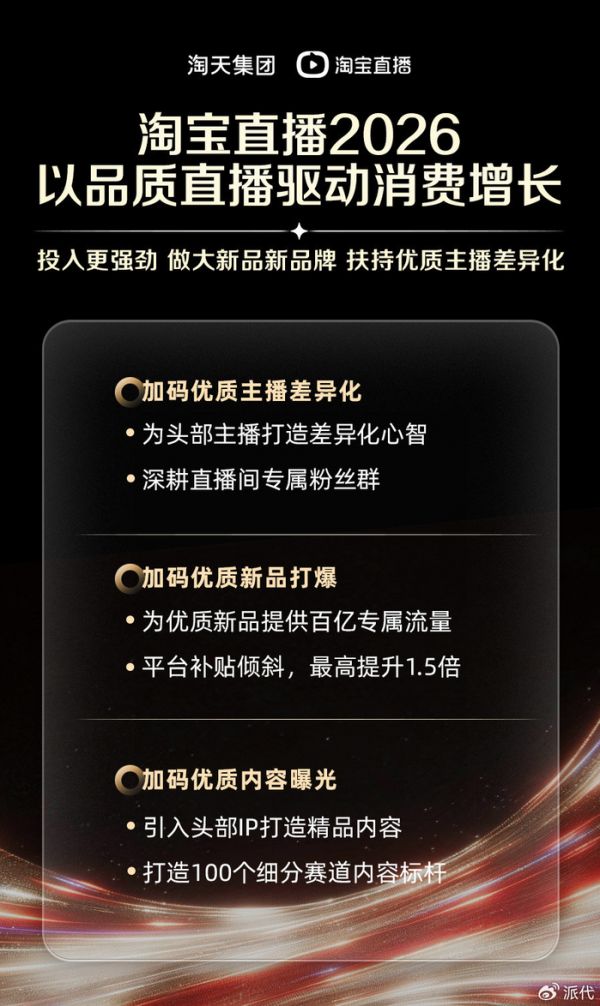4月8日,淘宝直播十周年盛典上宣布:2026年对品质直播的投入加码30%,通过增强优质主播差异化、加码优质新品和新品牌扶持、加投优质直播内容,实现品牌和达人的确定性增长。