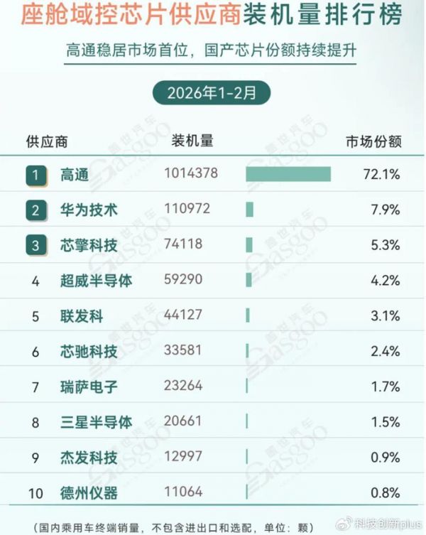 高通芯片的装车量,达到了101万颗,市场份额占比高达72.1%,而第二名的华为,份额只有7.9%,高通的这个市场占有率,比手机领域还要高。