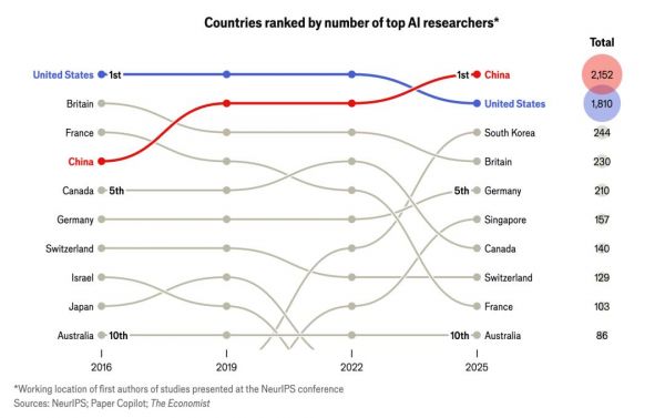 经济学人追踪了2025年12月举行的神经信息处理系统大会(NeurIPS)上发表论文的研究人员的教育背景,50%的AI研究人员在职业生涯初期来自中国(2019年仅为29%);与此同时,在美国起步的研究人员占比,则从20%下降到12%。它说明,全球AI顶尖研究人才的来源结构,正在重新洗牌。