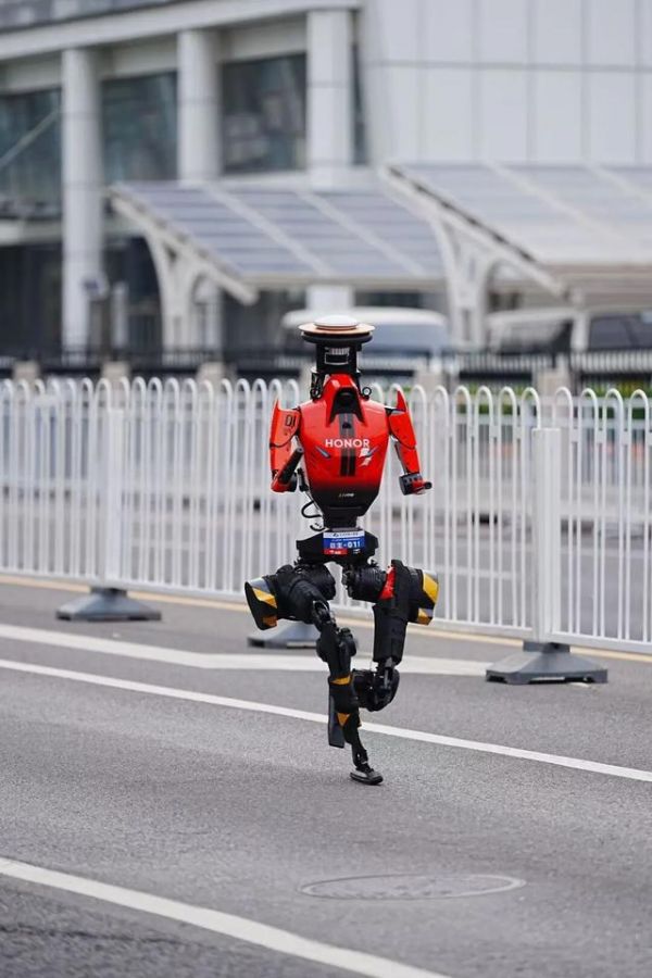 健步如飞的荣耀人形机器人“闪电”,身高169厘米,外观采用潮酷机甲风设计,兼顾空气动力学与视觉冲击力,核心竞争力是速度与爆发力,此次参赛的机型包括自主导航和遥控操作两款。开赛不到50分钟,三台荣耀“闪电”机器人先后冲过终点线,包揽了机器人组前三名。
