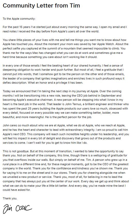 这一人事变动已获得苹果董事会全票通过,这场酝酿已久的CEO交接终于尘埃落定。