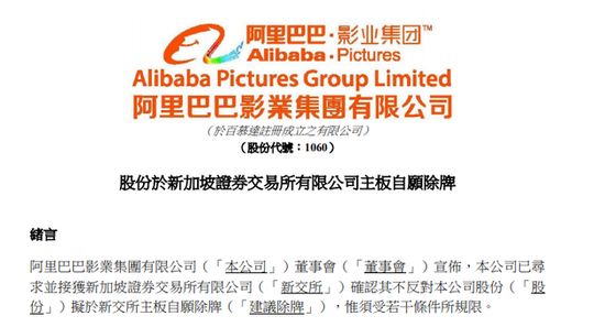 阿里影业:股份于新加坡证券交易所有限公司主板自愿除牌