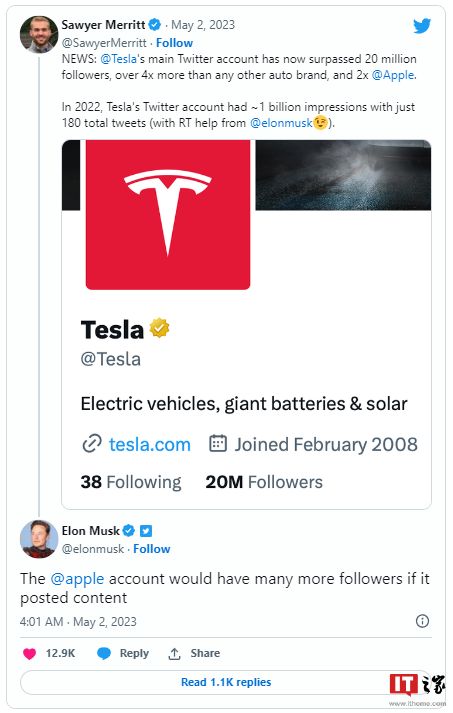 IT之家 5 月 2 日消息,电动汽车制造商特斯拉的创始人兼首席执行官埃隆・马斯克(Elon Musk)周一表示,如果苹果公司在推特平台上发内容,它会有“更多粉丝”。马斯克是推特的所有者和 CEO。