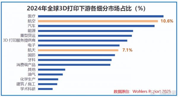 数据说话,2024年全球3D打印市场中,航空航天下游收入合计占比达到17.7%,已跃升为3D打印第一大下游市场。