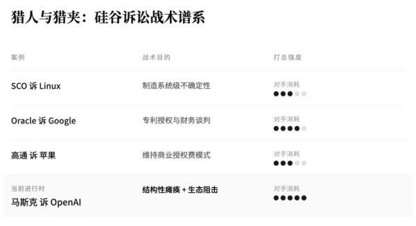 马斯克的做法并不令人意外,过去20年的硅谷充满了这种老套的剧情。高通诉苹果、Oracle诉Google……其核心逻辑如出一辙:通过制造巨大的不确定性,极限消耗对手资源,从而换取谈判筹码。