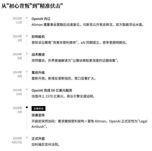 这场诉讼定于2026年4月27日在加州开庭,最终法官怎么判或许已不再重要。因为当OpenAI被拖入这片名为“正义”的泥潭时,马斯克的战术目标就已经达成了一半。